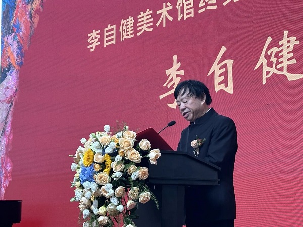 中国美术家协会主席范迪安 展览在激昂澎拜的钢琴曲《保卫黄河》中拉开帷幕,与“东方意蕴·时代精神”大展主题密切呼应,以此敬献给伟大祖国迎来76周年华诞!随着,一部总结性的视频一一《东方意蕴·时代精神一一中国写意油画学派十年历程》向出席开幕式的全体公众播放。开幕仪式上,李自健美术馆终身馆长、策展人李自健,北京当代中国写意油画研究院学术委员会主任杨参军,湖南省美协顾问黄铁山,展览学术主持、中央美术学院艺术管理与教育学院院长余丁分别发表了致辞和讲话。最后,中国美术家协会主席范迪安发表了总结性重要讲话。 中国写意油画融汇中国传统美学精神与西方油画技法,展现出鲜明的东方气韵与时代风貌。自二十世纪初徐悲鸿、林凤眠等先驱伊始,中国油画家始终致力于将写意观念与文化自觉融入油画实践,推动这一外来画种走向本土化、民族化。百余年来,几代油画家在吸收欧洲技法与当代艺术理念的同时,不断回归中国文化理念,积极探索具有中国审美特质的油画语言,传承发展了强劲深远的写意油画文脉。 作为建馆九周年的李自健美术馆,推出的这个规模空前、意义非凡的全国性学术品牌大展一一“东方意蕴·时代精神——中国写意油画大展”,充分展现了中国写意油画在现阶段所达到的艺术高度与学术深度。展览作品题材丰富、风格多元,尤其在写生与创作相融合的作品中,展现出前所未有的图式创新与精神表现力,充分彰显出中国油画在形式语言与精神内涵方面的双重成熟。他们基于民族文化精神的艺术表达、对当代中国文化发展与文明进步的关注和不断探索、勇攀艺术高峰的创作精神和自信表现,对当代油画艺术的发展产生了积极的推动作用。 2014年3月27月,习近平主席在法国巴黎联合国教科文组织总部演讲,指出:“中国传统画法同西方油画融合创新,形成了独具魅力的中国写意油画。”基于这种文化自信、文化强国战略的伟大精神激励,在中国美协主席范迪安的带领下,2016年,“北京当代中国写意油画研究院”在北京成立。从此,研究院引领中国写意油画学派的艺术家们以巨大热情与活力,积极探索“中国写意油画”在全球化语境中的独特艺术价值和精神内涵,努力展现其在新时代背景下的传承与创新。十年间,画家们以饱满的热情,走向祖国大地山川湖海,从“天下黄河”到“万里海疆”,从“塞外边陲”到“江南水乡”……中华大地,处处留下了油画家们挥洒的激情与汗水。活跃的学术研讨、频繁的展览交流使“中国写意油画”这一新的艺术概念,越来越被人们熟知和欢迎,在中国社会中迸发出前所未有的勃勃生机。于是,举办一场具有“东方意蕴,时代精神”的“中国写意油画艺术大展”,成了众望所归的美好愿景。 李自健美术馆始终坚持“人民至上”的办馆理念,积极履行“文化强国”的历史使命,以推动文化建设艺术交流为己任,对“东方意蕴·时代精神——中国写意油画大展”在湖南的举办倾力投入。李自健美术馆终身馆长、策展人李自健先生表示:此次展览,老、中、青三代同台展出,生动地表明中国油画的文脉在强劲传承。锐意进取的中国油画家们,不照搬西方,而是走向祖国山河,深入人民生活,从中国博大精深的文化根脉之中汲取营养,将个人的艺术激情与对家国、对时代的深厚情感融为一体。因此,展出的每一幅作品,不仅是技法的展现,更是精神的写照,充满了对当代中国文化发展与文明进步的关注。在中华民族伟大复兴的背景下,中国油画正以坚定的文化自信和鲜明的美学品格走向世界。 研究院撰写的展览前言指出,文化艺术历来与民族的强弱与盛衰,社会的变革与发展,国家的进步和文明发展相依相随。在世界发生百年未有之大变局、中国主题的话语越加坚定的今天,展览向观众展现了中国油画在民族化、本土化和写意性道路上的探索成果和创作成就,推动中国油画在全球化语境中的创新发展,为中国文化艺术繁荣注入新的活力,彰显了独特的东方气蕴与蓬勃的时代精神。