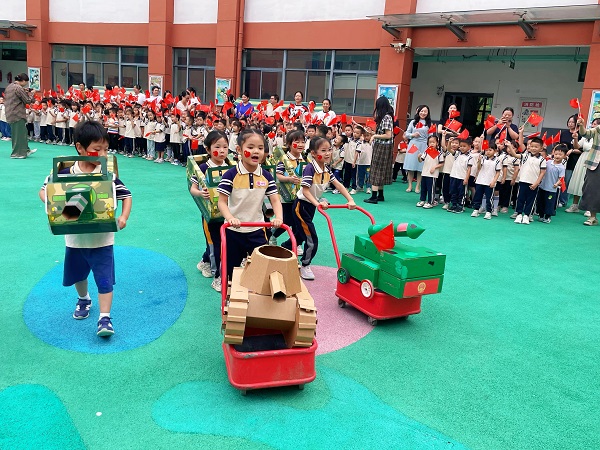 活动现场,孩子们的脸颊上贴着鲜艳的爱心贴纸,手中挥舞着小小的五星红旗,一张张灿烂的笑脸上写满了欢喜与自豪。活动的高潮是一场充满童真创意的“阅兵式”。孩子们化身为“小小国防设计师”,他们手持用卡纸精心制作的火箭、导弹模型,有的还将迷彩涂装的“坦克”模型套在身上,神气十足地迈着正步。后方,全体师生整齐列队,一同挥舞国旗,场面热烈而感人。
