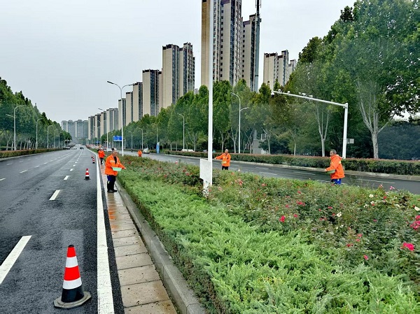 精准施策,科学养护提质效 针对秋季植物的生长特性,东瑞公司精心制定了“一地一策”的施肥方案。在双河公园,工作人员精准控制施肥深度和用量,针对地被植物和花灌木,采用撒施与穴施相结合的方式,确保肥料均匀覆盖并深入根系。在恒大悦龙花园,针对不同品种的乔木,通过环状沟施法,将肥料施于树冠投影外缘的环状沟内,既避免烧根又促进养分吸收。京港澳防护林则重点补充磷钾肥,以增强苗木的抗寒能力。龙湖外环路生态廊道和陇海路生态廊道的绿篱带则结合撒施与叶面喷施,确保肥料均匀渗透。