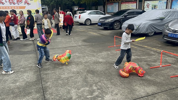 最热闹的莫过于“赶鸡入圈”项目。色彩鲜艳的母鸡形状气球成了顽皮的“目标”,参赛者们手拿大扇子,奋力扇动气流,试图将“小鸡”赶入终点线的鸡笼道具内,场面滑稽又激烈,围观的居民笑得前仰后合。