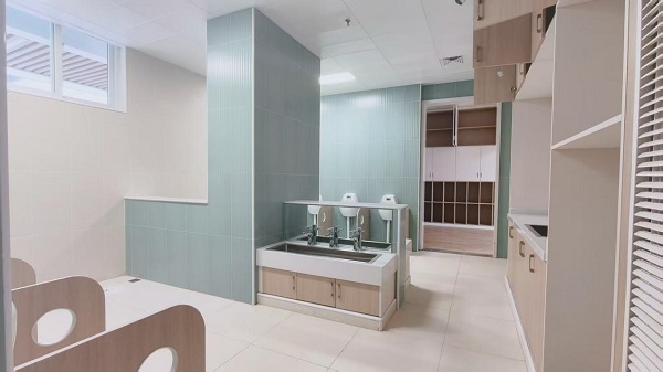 幼儿园卫生间拍图 明德幼儿园的正式完工,为项目社区生活注入了新的活力。对于适龄家庭而言,“目送式上学”的便利即将成为现实,家长们将省去通勤时间,有更多时间陪伴孩子成长。