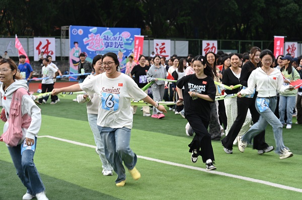活动以学生的“综合素质能力提升”理念为纲,将游戏中的闯关逻辑转化为可量化的教育目标。学生需在动态任务中完成资源收集与路径规划,考验个体统筹与临场应变能力,强化群体协作意识与战略思维。活动总策划李鑫语老师表示:“活动设计构建了统筹规划、资源整合、团队协作、应变创新、体育精神的五维评估体系,形成从基础能力到高阶思维的渐进式培养闭环。”这种将虚拟游戏机制转化为现实教育场景的创新设计,让知识获取与能力提升在趣味互动中自然发生。 活动现场,巨幅国旗在千人共擎下猎猎飘扬,青年学子以《歌唱祖国》的嘹亮歌声向祖国深情告白,将家国情怀融入青春实践。
