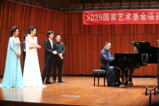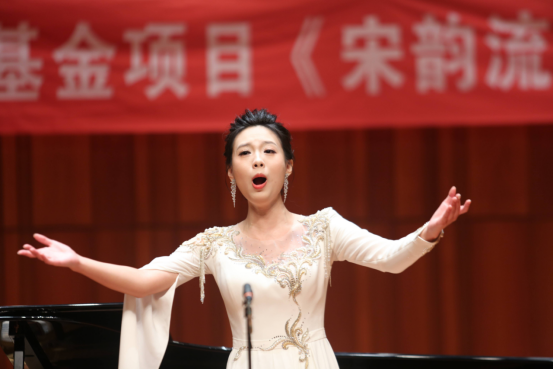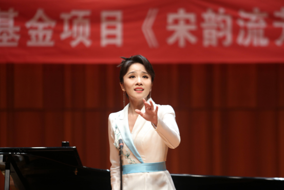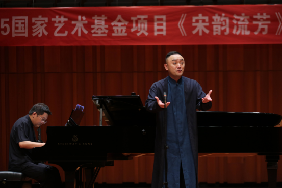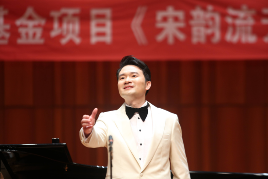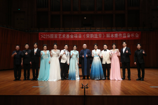 第二篇章“夜·宋”则聚焦于宋代文学家的知名词作,苏轼的《西江月·世事一场大梦》、范仲淹的《渔家傲·秋思》、王安石的《泊船瓜洲》等经典作品被逐一呈现。此篇章中,解本康亲自登台演唱了声乐套曲《宋韵流芳》中的三首曲目——《相见欢·无言独上西楼》《临江仙·梦后楼台高锁》和《思远人·红叶黄花秋意晚》。他用深情而富有感染力的演唱,将宋代文人的才情与情感融入音乐之中,让观众仿佛置身于那个充满诗意与哲思的宋代夜晚。解本康的演唱不仅展现了他对作品的深刻理解,更体现了他对音乐的热爱与执着,赢得了现场观众的阵阵掌声。