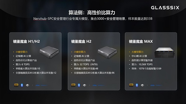 降误报提精度:大模型深度推理能力使检测准确度达 97%,较传统小模型(最高 90%)显著降低误报率,减少人工核验成本。 灵活适配场景:支持 “纯小模型”“小模型 + 大模型”“纯大模型” 三种模式,既能满足单一场景快速检测,也能应对复杂环境下的高精度需求,比如吊装区人员违规识别、油气区火焰烟雾监测等。 零代码快速迭代:通过 Nervhub AI 生产平台,普通人无需代码基础,几小时即可定制专属小模型,较传统 14-21 天的开发周期大幅提速。 2. 镜鉴魔盒 MAX:填补高算力本地化监管空白 针对不同场景算力需求,第六镜推出镜鉴魔盒系列硬件,其中镜鉴魔盒 MAX为大规模厂区监管提供核心算力支撑: