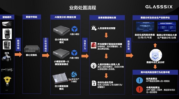 超高算力:算力达上万 TOPS,每分钟可处理 1076 条违规报警,支持上百路视频流同时分析,适配炼油厂、海上石油平台等大场景。 本地化高效运行:边缘计算设计降低网络带宽依赖,毫秒级响应设备异常、人员违规等风险,避免云端延迟问题;同时保障数据不外出,解决企业数据安全顾虑。 高性价比覆盖:除 MAX 外,还有算力 6TOPS 的 H1(适配 12 路摄像头)、32TOPS 的 H2(适配 96 路摄像头),满足小范围、低成本的监管需求。 3. 全流程闭环:从检测到整改的 “一站式管理” 平台以 “1+N” 架构整合数据(“1” 个可视化管理中枢 +“N” 个子系统),结合无人机、巡检机器人、气体传感器等硬件,实现 “实时预警 - 联动响应 - 闭环整改”: