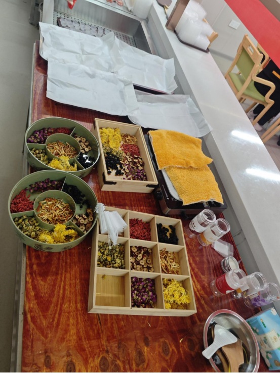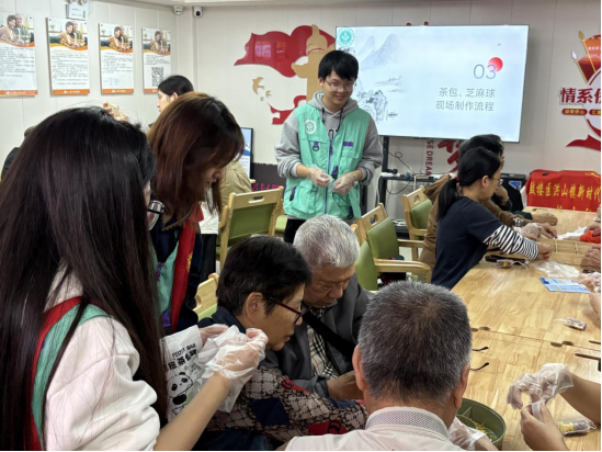 手作环节设置了养生茶包与传统芝麻球两项体验内容。志愿者提前备好干花、药材、茶包袋等材料,指导老人们根据自身喜好与需求搭配配方——偏爱清甜口感的可添加桂圆,注重润燥的可增加麦冬用量。现场还特别设置茶包互赠环节,老人们将亲手制作的茶包赠予邻里亲友,让健康与温情随茶香传递。