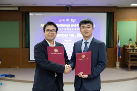 泰国:两校联动,搭建教育合作网络 在泰国,代表团前往泰国国王科技大学(KMUTT),就课程体系对接、师生交流项目等达成合作并签署协议,随后前往泰国格乐大学(Krirk University),并受到泰国前外交部长、现格乐大学校长杨金泉(Pro. Dr. Krasae Chahawohgse),理事长王长明及校方领导班子热情接待,在格乐大学挂牌“海外合作基地”,进一步织密东南亚地区教育合作网络。