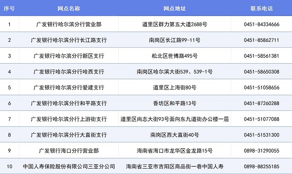 温馨提示 受系统更新影响,以当时社保智慧窗办理内容为准。 部分业务每个月25号至月末暂停办理,具体请详情网点,请合理安排您的时间 【结束语】广发银行哈尔滨分行将提供暖心的养老金融服务,让您在家门口就能高效便捷的办理社保业务,无需奔波,快转发至“相亲相爱一家人”群,让更多老伙伴少跑腿吧! 合作网点